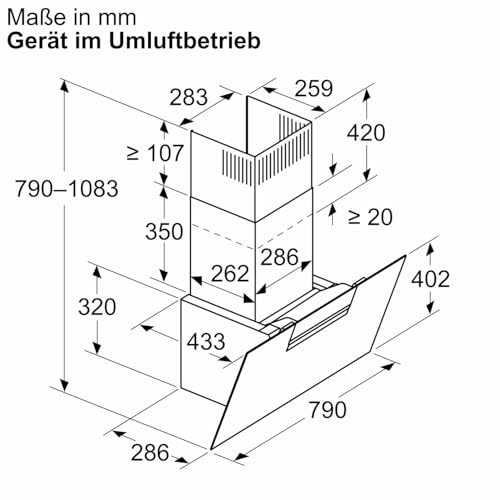 Gerätemaße (H × B × T, Abluft) ca. 883–1126 × 790 × 433 mm (höhenverstellbar)